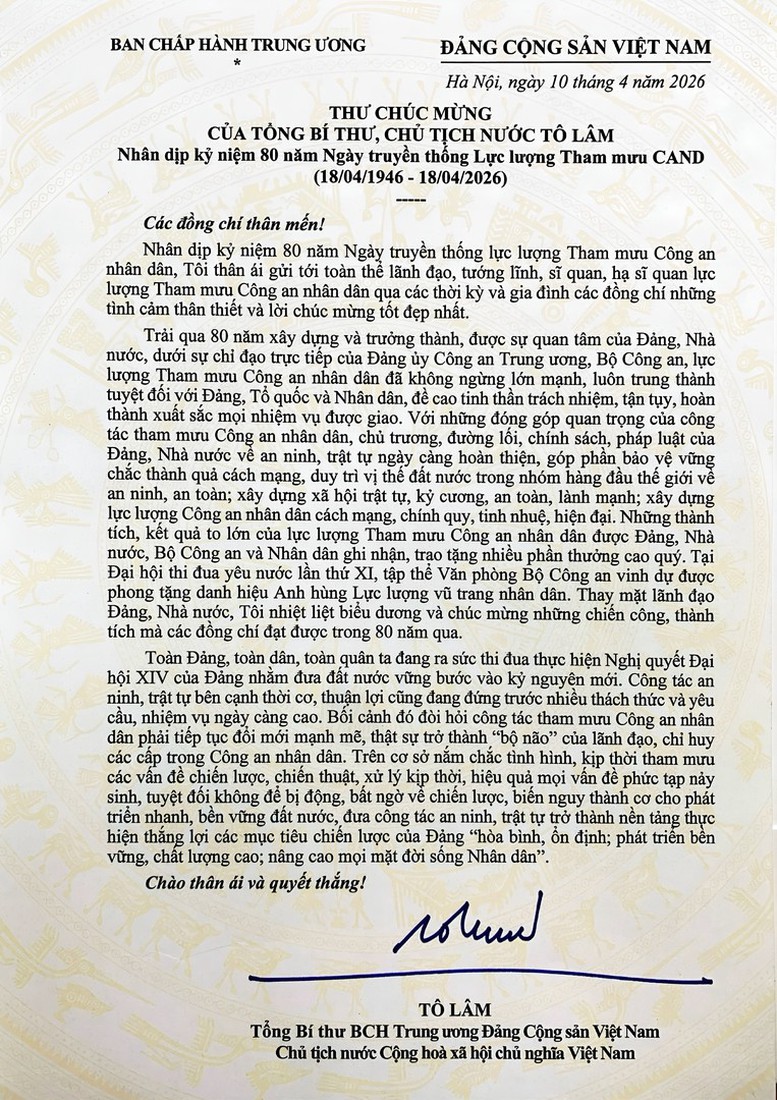 Nhân dịp kỷ niệm 80 năm Ngày truyền thống lực lượng tham mưu Công an nhân dân (18/4/1946 – 18/4/2026), Tổng Bí thư, Chủ tịch nước Tô Lâm gửi thư chúc mừng.