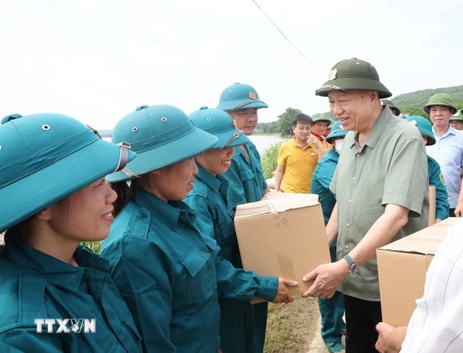 Tổng Bí thư, Chủ tịch nước Tô Lâm động viên, tặng quà lực lượng làm nhiệm vụ củng cố, khắc phục sự cố một số điểm xung yếu ở đê sông Lô, xã Trường Sinh, huyện Sơn Dương, tỉnh Tuyên Quang. (Ảnh: Trí Dũng/TTXVN)