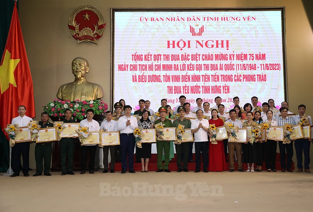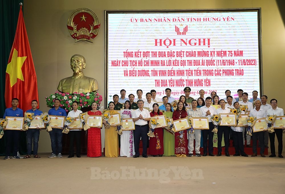 Ngày 9/6, UBND tỉnh tổ chức hội nghị tổng kết đợt thi đua đặc biệt chào mừng kỷ niệm 75 năm Ngày Chủ tịch Hồ Chí Minh ra Lời kêu gọi thi đua ái quốc (11/6/1948 - 11/6/2023) và biểu dương, tôn vinh điển hình tiên tiến trong các phong trào thi đua yêu nước tỉnh Hưng Yên. Dự hội nghị có các đồng chí: Nguyễn Hữu Nghĩa, Ủy viên BCH Trung ương Đảng, Bí thư Tỉnh uỷ; Trần Quốc Toản, Phó Bí thư Thường trực Tỉnh uỷ, Chủ tịch HĐND tỉnh; Trần Quốc Văn, Phó Bí thư Tỉnh uỷ, Chủ tịch UBND tỉnh, Chủ tịch Hội đồng Thi đua - Khen thưởng tỉnh; các đồng chí trong Ban Thường vụ Tỉnh uỷ, Thường trực HĐND, lãnh đạo UBND, Ban Thường trực Uỷ ban MTTQ Việt Nam tỉnh; lãnh đạo các ban, sở, ngành, địa phương trong tỉnh và 75 điển hình tiên tiến trong các phong trào thi đua yêu nước trên địa bàn tỉnh.