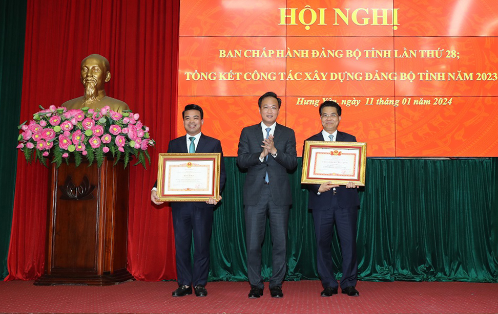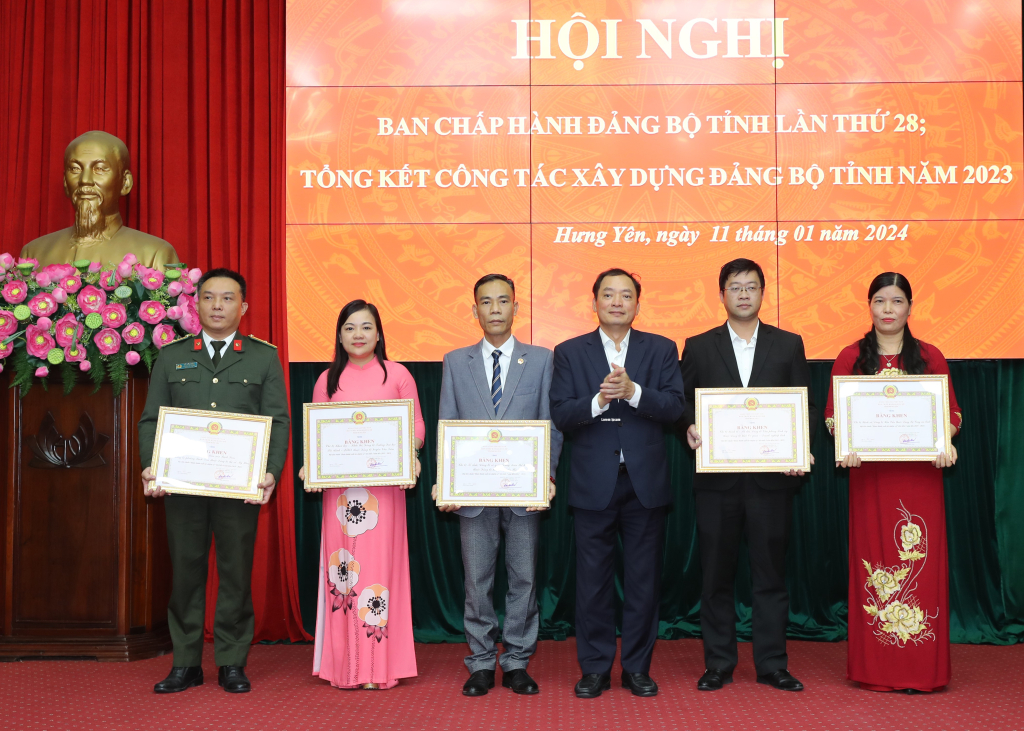 Tại hội nghị, thừa ủy quyền của Thủ tướng Chính phủ, đồng chí Nguyễn Hữu Nghĩa, Ủy viên BCH Trung ương Đảng, Bí thư Tỉnh ủy trao danh hiệu Chiến sỹ thi đua toàn quốc và Bằng khen của Thủ tướng chính phủ tặng các cá nhân có thành tích xuất sắc trong công tác, góp phần vào sự nghiệp xây dựng chủ nghĩa xã hội và bảo vệ Tổ quốc; trao Bằng khen của Ban Thường vụ Tỉnh ủy tặng 3 Đảng bộ cấp trên cơ sở đạt tiêu chuẩn “Hoàn thành xuất sắc nhiệm vụ” tiêu biểu năm 2023. Đồng chí Trần Quốc Toản, Phó Bí thư Thường trực Tỉnh ủy, Chủ tịch HĐND tỉnh trao Cờ của Ban Thường vụ Tỉnh ủy tặng 4 tổ chức cơ sở đảng đạt tiêu chuẩn “Hoàn thành xuất sắc nhiệm vụ” tiêu biểu 5 năm liền (2019 - 2023); trao Bằng khen của Ban Thường vụ Tỉnh uỷ tặng 5 tổ chức cơ sở đảng đạt tiêu chuẩn “Hoàn thành xuất sắc nhiệm vụ” tiêu biểu 5 năm liền (2019 - 2023). Đồng chí Trần Quốc Văn, Phó Bí thư Tỉnh ủy, Chủ tịch UBND tỉnh trao Bằng khen của Ban Thường vụ Tỉnh uỷ tặng 5 chi bộ trực thuộc đảng ủy cơ sở đạt tiêu chuẩn “Hoàn thành xuất sắc nhiệm vụ” tiêu biểu 5 năm liền (2019 - 2023).