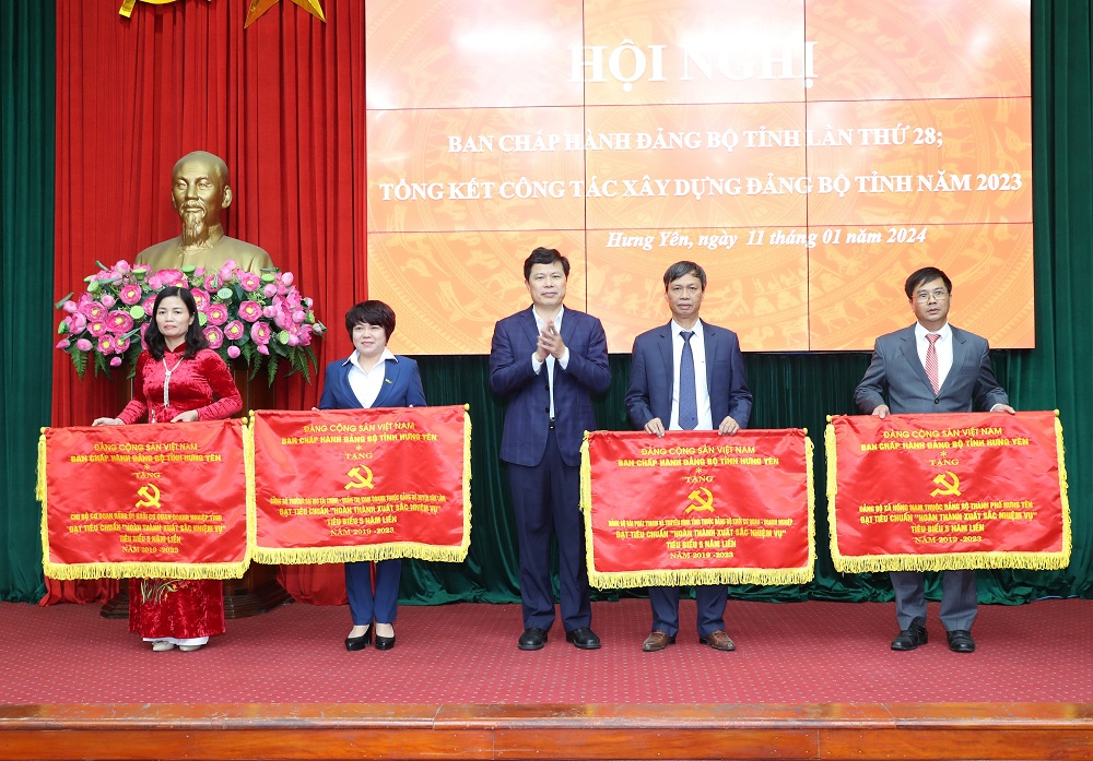 Đồng chí Trần Quốc Toản, Phó Bí thư Thường trực Tỉnh ủy, Chủ tịch HĐND tỉnh trao Cờ của Ban Thường vụ Tỉnh ủy tặng 4 tổ chức cơ sở đảng đạt tiêu chuẩn “Hoàn thành xuất sắc nhiệm vụ” tiêu biểu 5 năm liền (2019 - 2023)
