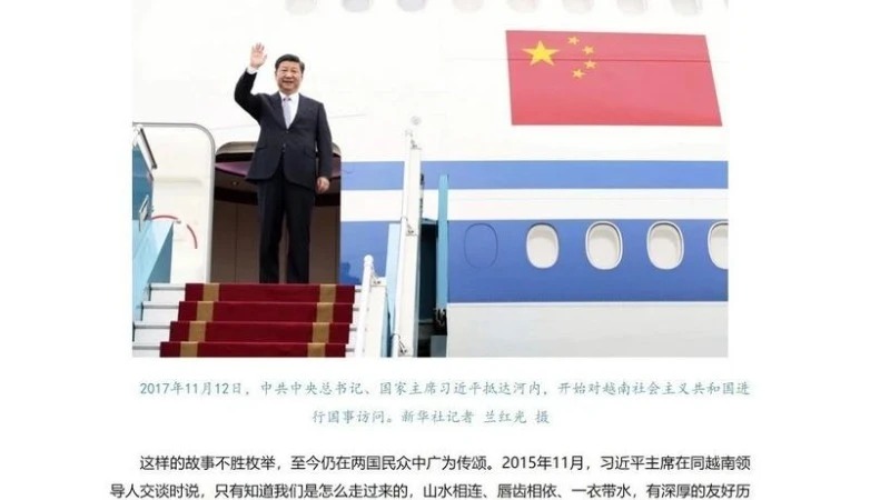 Ảnh minh họa trong bài viết của Nhân dân nhật báo: Ngày 12/11/2017, Tổng Bí thư, Chủ tịch Tập Cận Bình đến Hà Nội, bắt đầu chuyến thăm cấp nhà nước đến Việt Nam. (Ảnh: Công Tuyên/TTXVN)