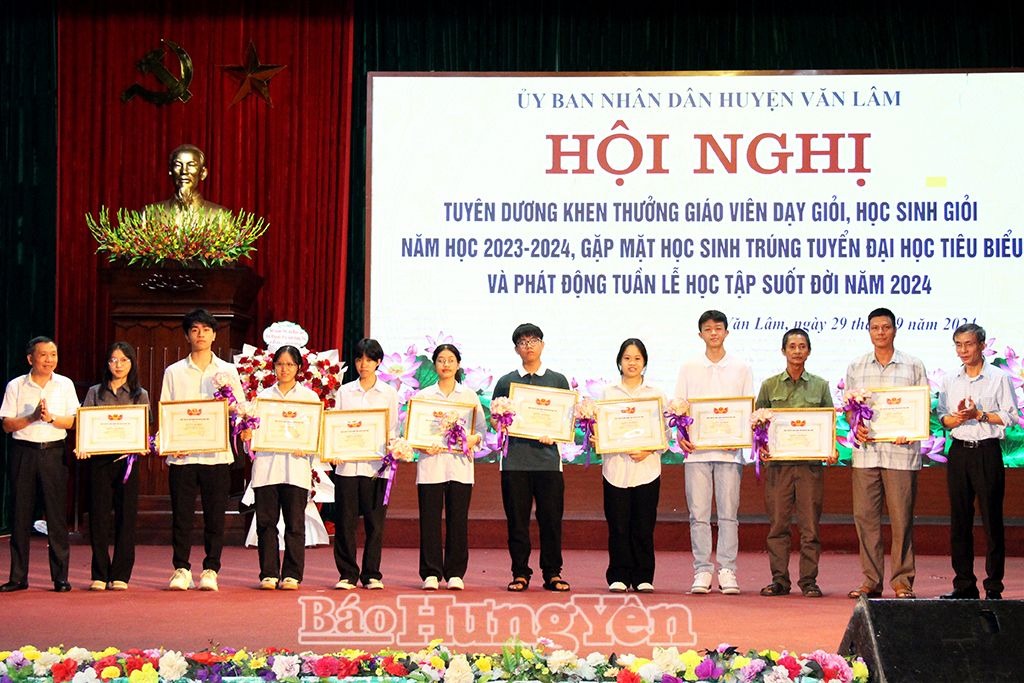 * Ngày 29/9, UBND huyện Văn Lâm tổ chức hội nghị tuyên dương, khen thưởng giáo viên dạy giỏi, học sinh giỏi năm học 2023-2024; gặp mặt học sinh trúng tuyển đại học tiêu biểu năm 2024 và phát động Tuần lễ hưởng ứng học tập suốt đời năm 2024.