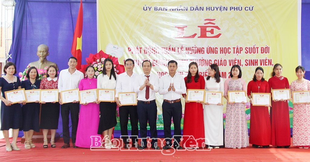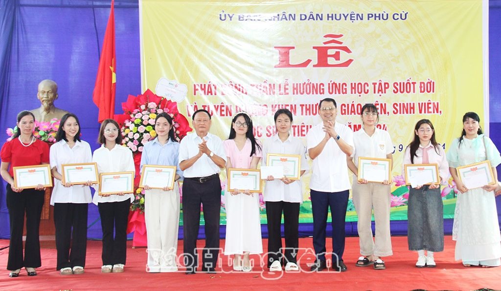 Tại buổi lễ, huyện Phù Cừ tuyên dương, khen thưởng 41 giáo viên dạy giỏi và có thành tích bồi dưỡng học sinh giỏi; 1 sinh viên tốt nghiệp đại học loại xuất sắc; 128 học sinh đạt giải trong các kỳ thi chọn học sinh giỏi cấp tỉnh, cấp huyện; 37 học sinh có điểm xét tuyển đại học đạt từ 27 điểm trở lên trong kỳ thi tốt nghiệp THPT năm 2024; trao 100 phần quà tặng các học sinh nghèo, học sinh có hoàn cảnh khó khăn vươn lên trong học tập.