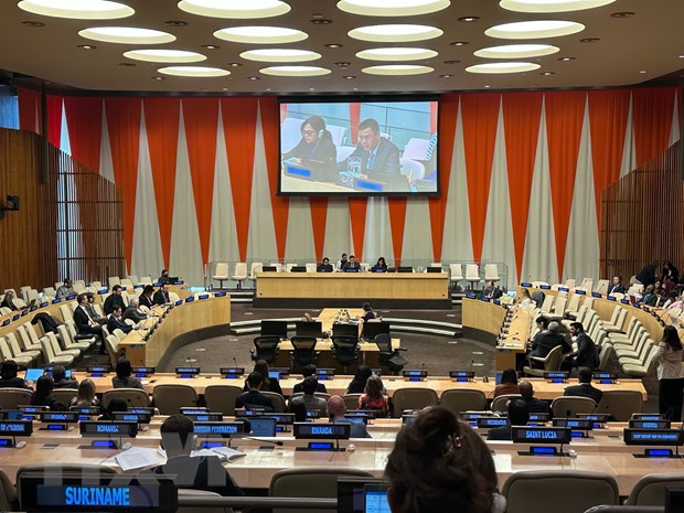 Các đại biểu Việt Nam tham dự phiên họp của Đại Hội đồng Liên hợp quốc khóa 77 để thảo luận về hoạt động của Tòa án Công lý Quốc tế. (Ảnh: TTXVN phát)