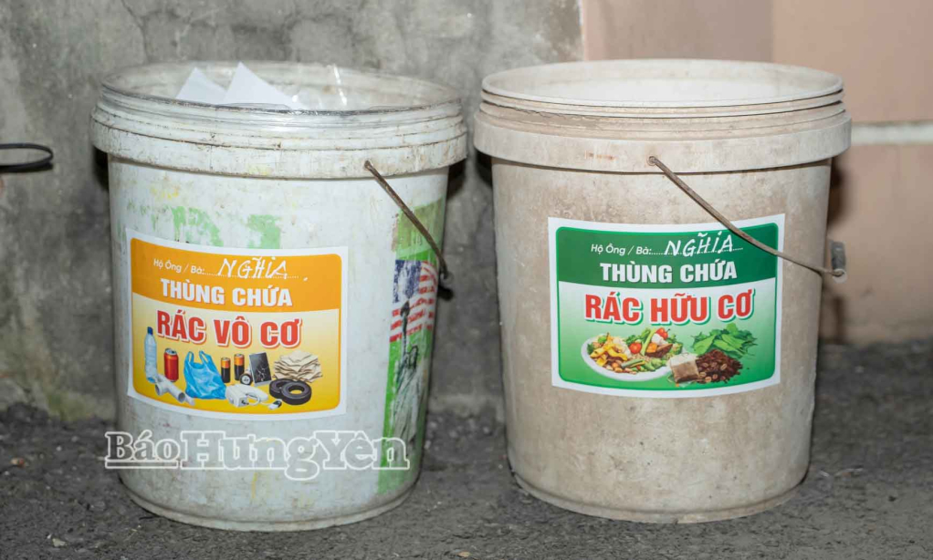 Các hộ dân trong xã Hoàn Long thực hiện việc phân loại rác thành hai nhóm hữu cơ và vô cơ, chứa trong các thùng riêng biệt.